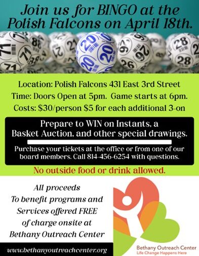 [Read More...]Join us for an evening of fun at this event to benefit the Bethany Outreach Center. Doors will open at 5 pm and the games begin at 6 pm. Admission is $30 per person. Take part in the ALL-CASH BINGO Games, and optional Basket raffle, Tips, and Instants. On the day of this event the kitchen…